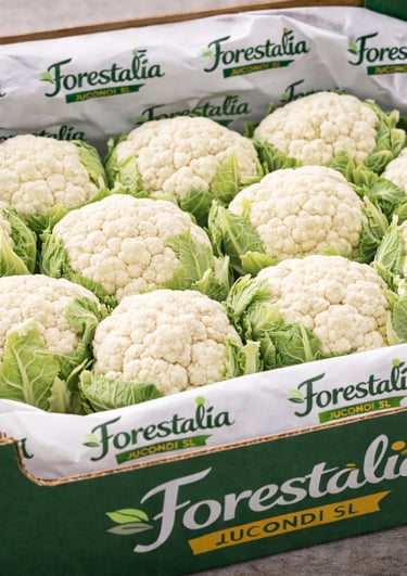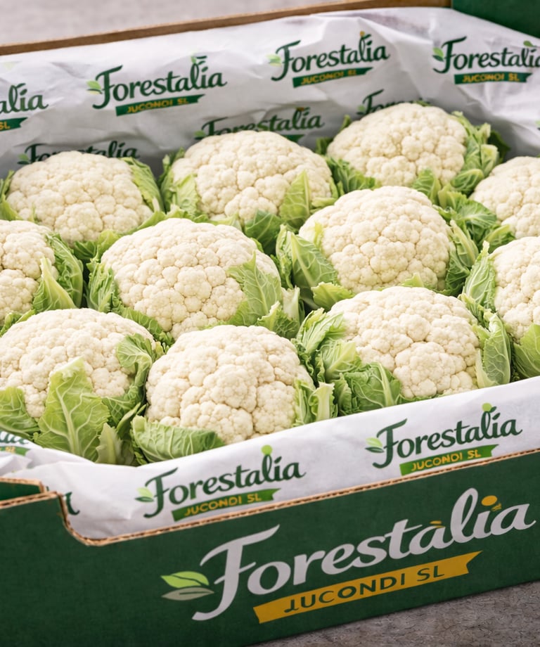 Coliflor compacta y uniforme, cultivada bajo estrictos estándares de calidad para asegurar frescura y trazabilidad en cada entrega.